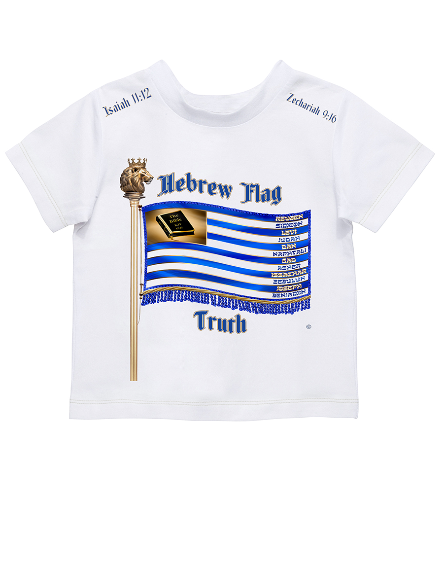 The front of the T-shirt prominently displays the Hebrew flag along with depictions of the original 12 Tribes of Israel. Inspirational Bible scriptures from Isaiah 11:12 and Zechariah 9:16 enhance the garment’s spiritual significance.